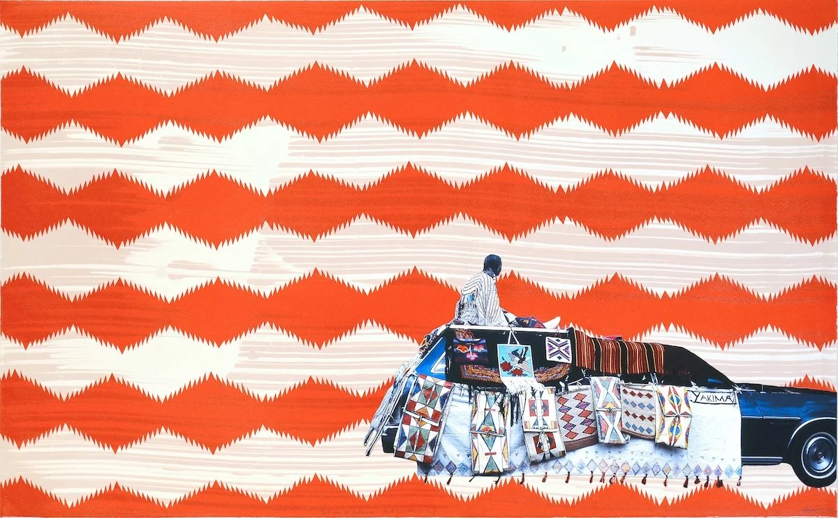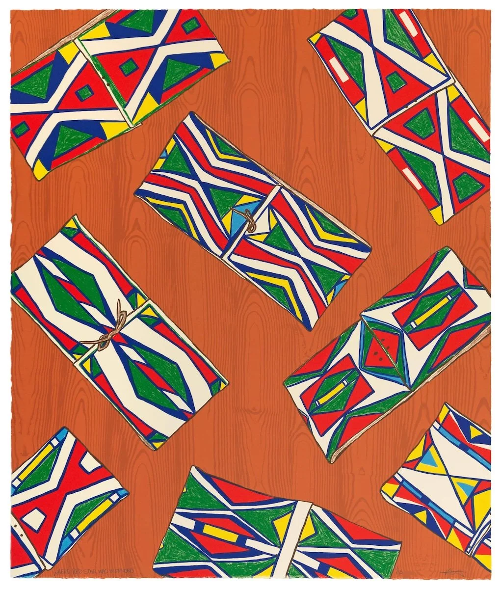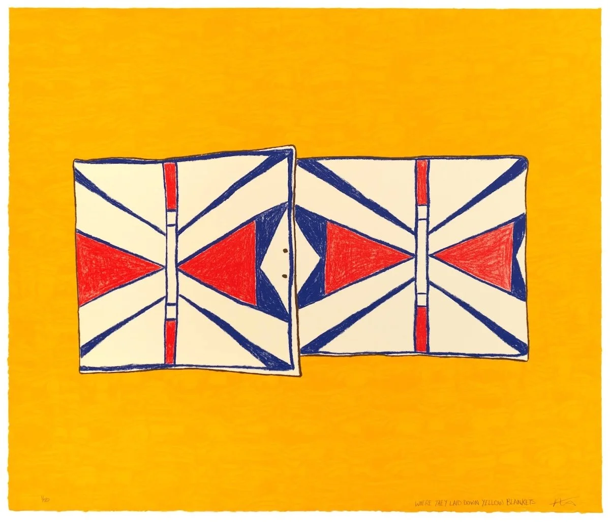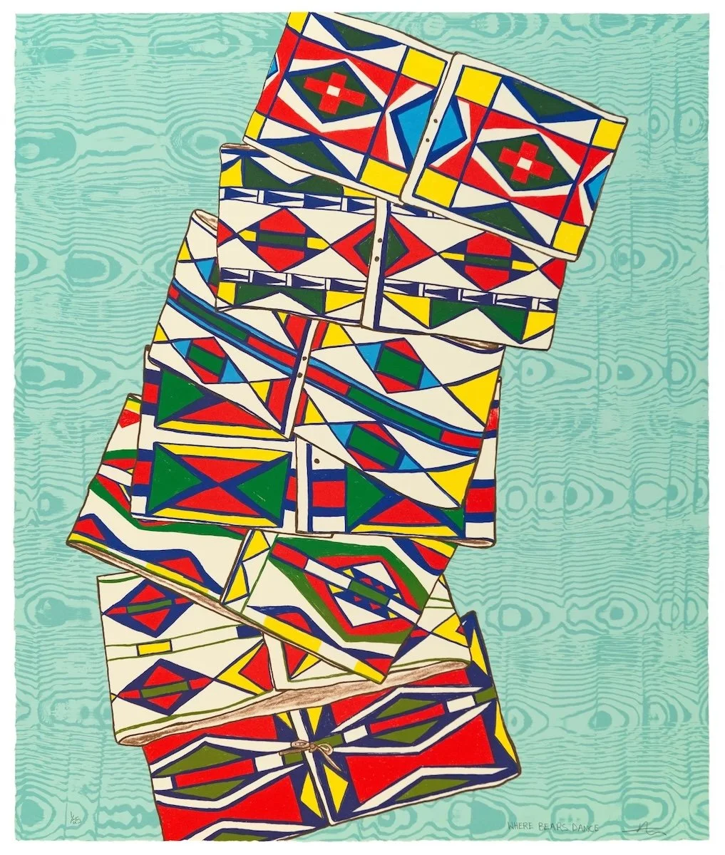These prints are part of an ongoing series exploring the social and material history of bishkisché. This Apsáalooke term is used to describe heirloom rawhide cases fabricated and decorated by the women of Indigenous tribes throughout North America, translating to “backpack for dogs to carry meat or grain.” Historically referred to as parfleche—a French phrase introduced during the colonial fur trade—in Western European scholarship, Red Star intends to use this series to restore the creative lineage and language of her Apsáalooke ancestry. A functional object used for transporting goods and possessions on horse across the Great Plains, each bishkisché features two painted panels with a mirrored pattern—a unique visual symbology invented by their maker. Growing up on the Crow Indian Reservation in Montana, Red Star recalls her grandmother with a creative project always in hand—perpetually sewing, beading, and drawing. While her matrilineal ancestors may not have described themselves as artists, they had robust artistic practices and established the aesthetic vocabulary of their tribal community—envisioning vibrant, geometric designs comprised of intersecting triangles, zig-zagging lines, and lean sequenced rectangles rendered in rich primary- toned pigments.