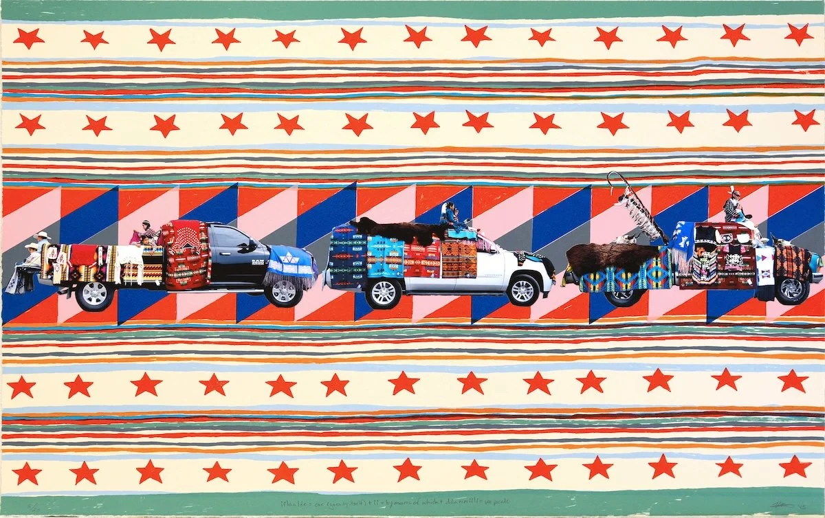 Part of a series of limited-edition prints handmade by Wendy Red Star over a period of five months during her third residency at Crow’s Shadow, these prints feature repeated photographic elements with portraits of Red Star’s family. Star Quilts were very precious items that were given away and shared at ceremonial rites: the quilt pattern, stars, and historical photos are all carriers of stories.