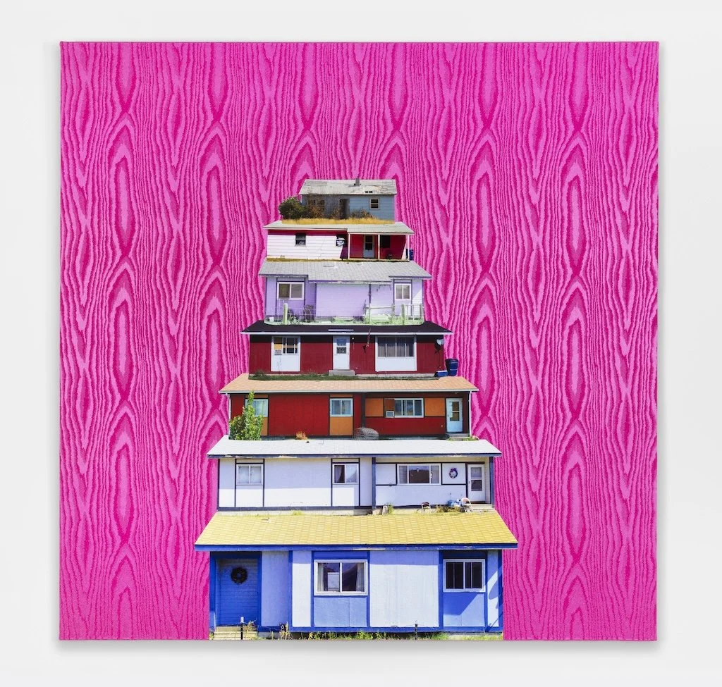 One could be forgiven for making the visual connection between Andy Warhol’s candy-colored pop art prints of both the ordinary and the famous and Wendy Red Star’s rez cars and houses series, shot in the brilliant Montana light in the summers of 2007 and 2008. The cars and especially the homes—cobalt, burnt orange, peach, flamingo pink, gold—are mounted on colored satin, evocative of a late 1970s suburban interior decorating aesthetic. The visual connection to Warhol’s sometimes garish color choices belies the truth of the rez homes: the rez home colors were not chosen by their occupants, or by the artist, but rather by the U.S. Government. They were, in fact, imposed colors. One could argue that neither did Warhol’s subjects/objects choose their own palettes—Warhol did—but Warhol’s colors weren’t selected because they were the least common denominator. Wendy Red Star’s father speculated that the colors of the houses were the result of the government buying the cheapest paint available, thus the motley palette, found nowhere but there. These were cast-off colors, suitable only for rez homes, and applied in staccato fashion to each of the three architectural styles found on the rez. That the home’s occupants chose not to repaint them is itself a form of resistance, its own kind of agency, a refusal to assign value to the choice and not to expend effort undoing yet another imposition.